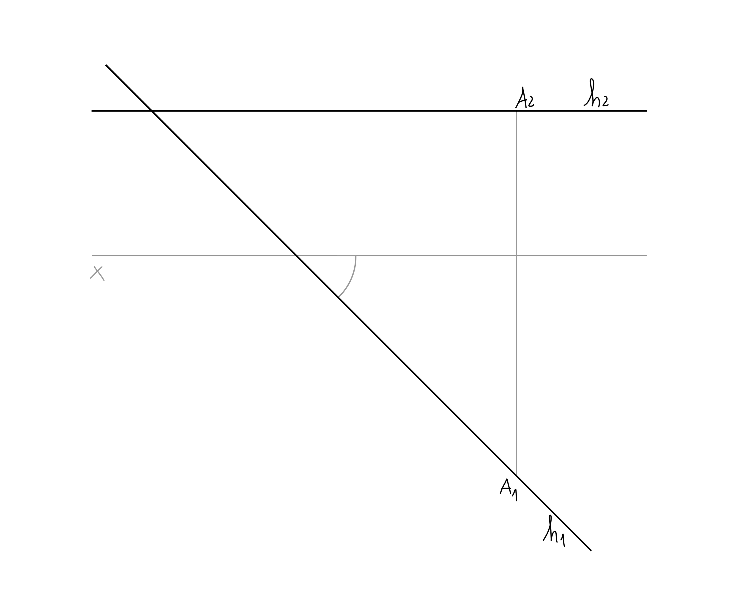 Todos os pontos da reta horizontal h têm igual cota, pelo que a projeção frontal, h2, é paralela ao eixo x. O ângulo entre a reta h e o plano frontal de projeção projeta-se em verdadeira grandeza no plano horizontal de projeção, entre a projeção horizontal, h1, e o eixo x.